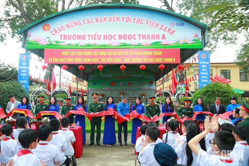 Các đại biểu cắt băng khánh thành công trình thanh niên "Thư viện xanh" tại Trường Tiểu học Ngọc Thanh A. Ảnh: PHẠM QUÂN
