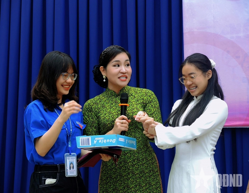 Tiến sĩ tâm lý học Tô Nhi A (giữa) giao lưu cùng học sinh trong chương trình “Trường học hạnh phúc – Học sinh tích cực” tại một trường THPT.