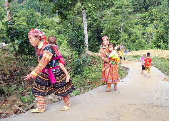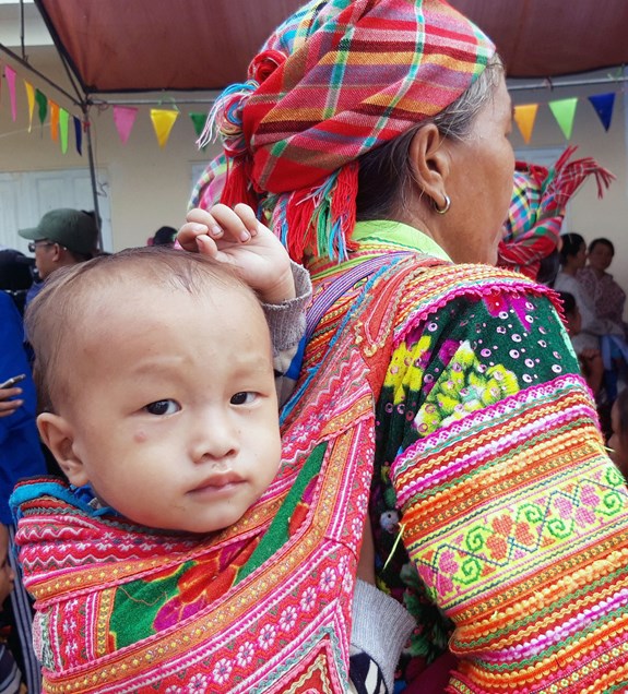 Gùi con trên lưng trong niềm hân hoan đón công trình mới. |