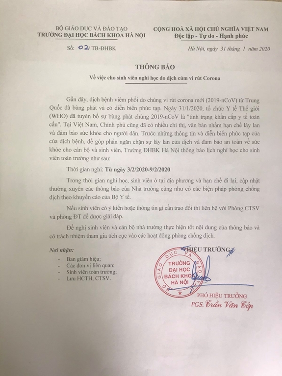 Ban Giám hiệu trường ĐH Bách khoa Hà cũng đề nghị học sinh, sinh viên trong thời gian nghỉ ở nhà hạn chế đi lại và áp dụng các biện pháp để ngăn ngừa dịch bệnh để bảo vệ mình, người thân và cộng đồng trước một dịch bệnh khó lường...