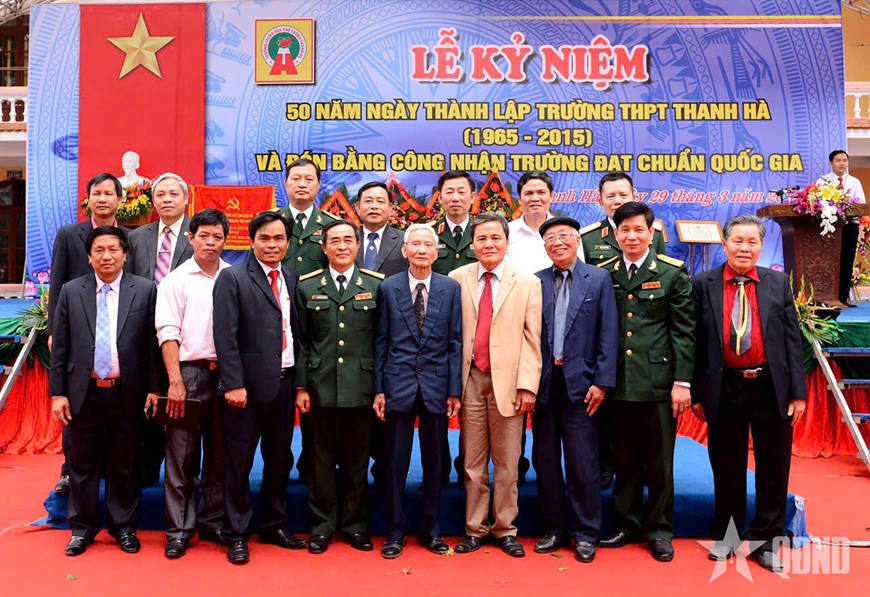 | Đại diện Ban giám hiệu qua các thời kỳ, lãnh đạo địa phương cùng các tướng lĩnh sĩ quan Quân đội tại Lễ kỷ niệm 50 thành lập nhà trường tháng 11-2015. |