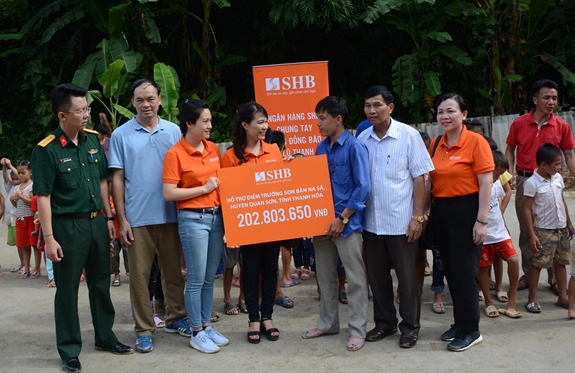 Báo Quân đội nhân dân và Ngân hàng TMCP Sài Gòn-Hà Nội (SHB) tặng quà, giúp đỡ Trường Tiểu học Na Mèo, xã Na Mèo, (Quan Sơn, Thanh Hóa) khắc phục ảnh hưởng của cơn bão số 3 trước thềm năm học mới. Ảnh: TRÌNH HIẾU. |
