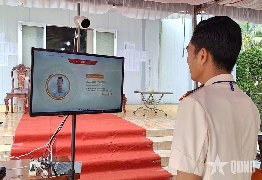 Đại biểu điểm danh qua hệ thống nhận diện khuôn mặt tại Đại hội Đảng bộ xã Ninh Quới. Ảnh: THÚY AN |