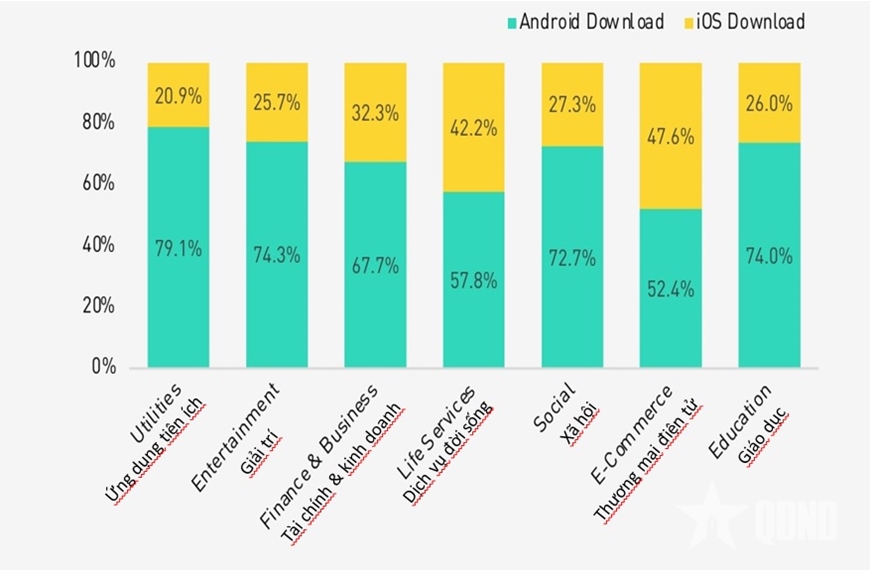 Báo cáo chỉ ra sự khác biệt rõ rệt giữa hai hệ điều hành phổ biến nhất là Android và iOS. Theo đó, Android tiếp tục là nền tảng dẫn đầu về quy mô người dùng mới và số lượng lượt tải xuống trong khi iOS thống trị về khả năng tạo ra doanh thu giá trị cao, đặc biệt trong phân khúc tài chính và dịch vụ đời sống.