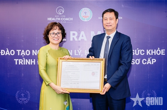 PGS, TS Nguyễn Thị Việt Hương, Phó tổng cục trưởng Tổng cục Giáo dục Nghề nghiệp trao Giấy chứng nhận Hoạt động ngành Quản lý, Huấn luyện sức khỏe đối với HCCP (tháng 2-2024). Ảnh: HCCP