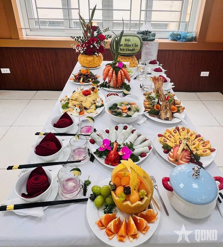 Mâm cơm dự thi của đội Cục Hậu cần - Kỹ thuật tại hội thi.