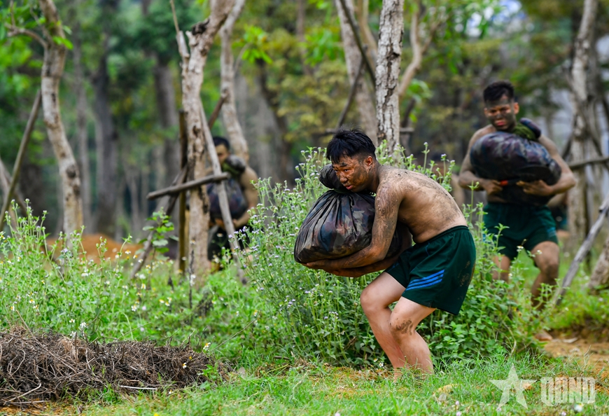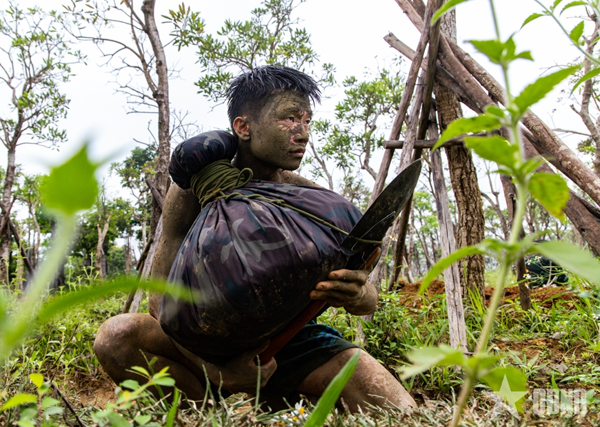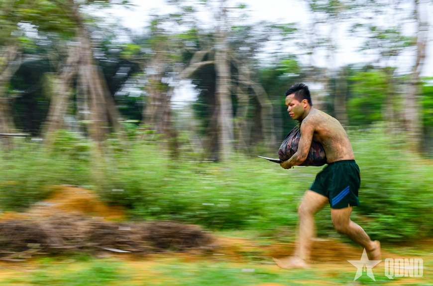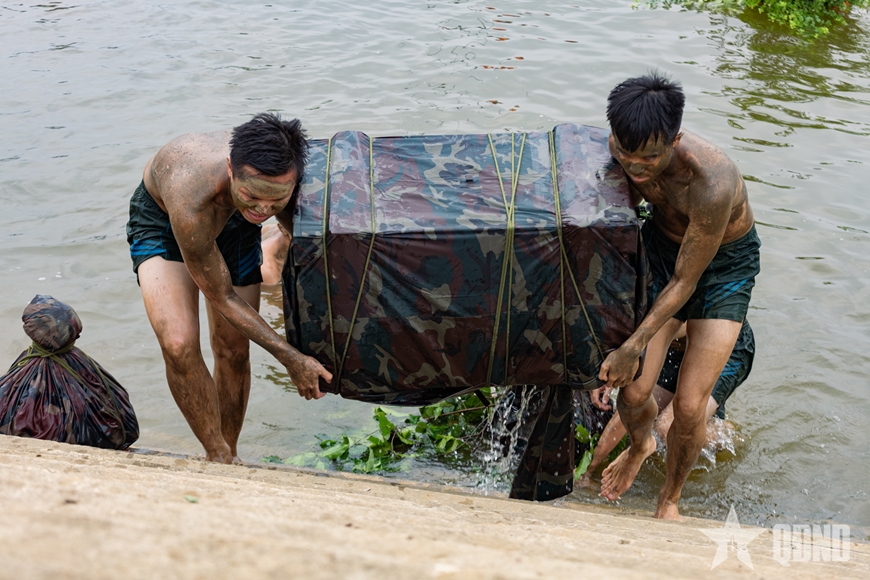 | Học viên hoàn thành công tác chuẩn bị bao gói, ngụy trang tiếp cận tuyến chờ đợi vượt sông. |