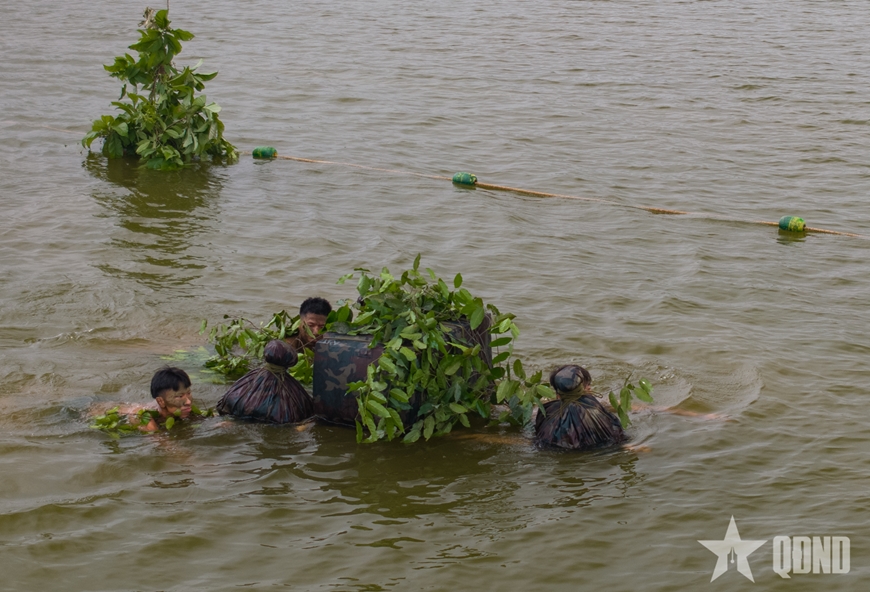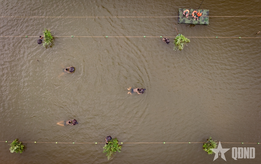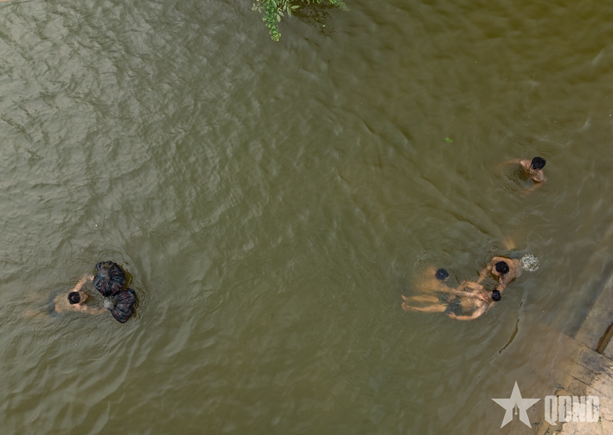 | Tổ bảo đảm nhanh chóng bơi tới các vị trí cảnh giới bảo đảm hành lang vượt sông. |