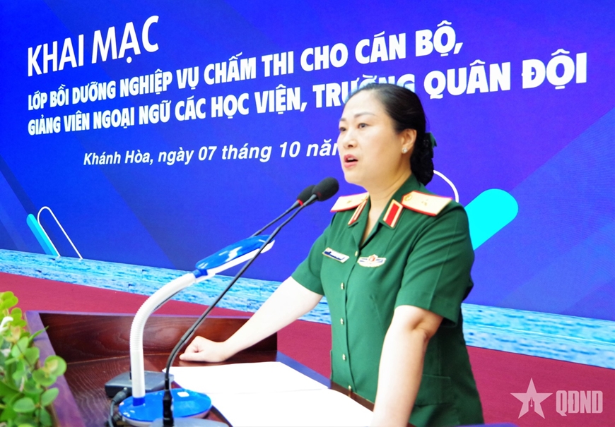 Phát biểu khai mạc, Thiếu tướng Phùng Thị Phú nhấn mạnh, lớp bồi dưỡng nhằm bổ sung kiến thức chuyên sâu, kỹ năng cần thiết trong chấm thi nói và viết; trực tiếp thực hành, trao đổi kinh nghiệm, hình thành sự thống nhất trong đánh giá năng lực ngoại ngữ, nâng cao bản lĩnh nghề nghiệp; xây dựng đội ngũ khảo thí ngoại ngữ ngày càng chuyên nghiệp, hiện đại, góp phần nâng cao chất lượng dạy, học ngoại ngữ trong các học viện, trường Quân đội.