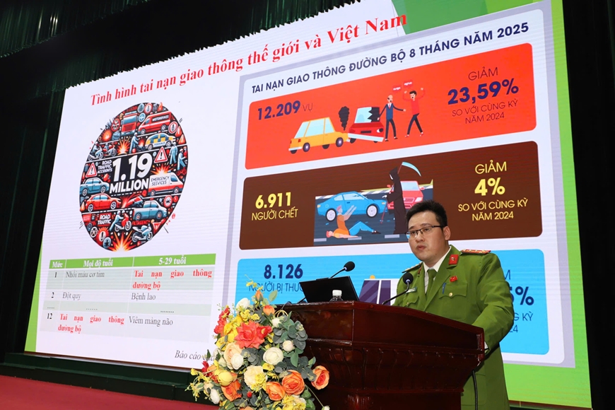 Đại úy, Thạc sĩ Phạm Tiến Tài, báo cáo viên tại hội nghị chia sẻ thông tin về bảo đảm an toàn giao thông, phòng, chống tai nạn thương tích.