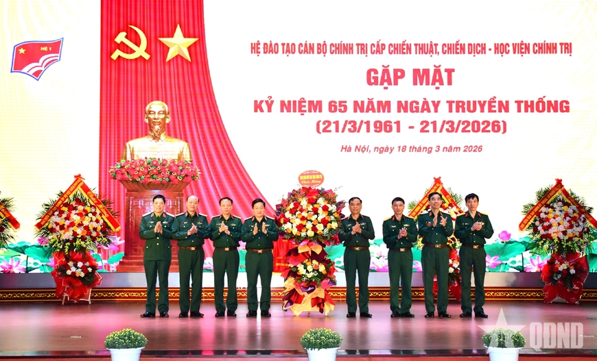 | Lãnh đạo Học viện Chính trị tặng hoa chúc mừng Hệ đào tạo cán bộ chính trị cấp chiến thuật, chiến dịch. |