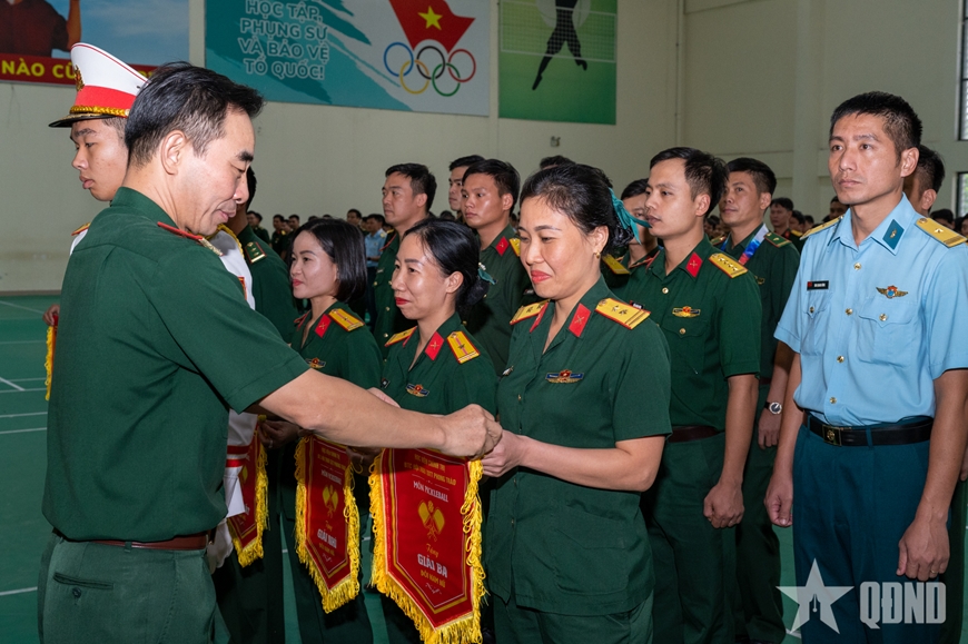 Thiếu tướng Vũ Đức Long, Phó chính ủy Học viện Chính trị trao thưởng cho các vận động viên.