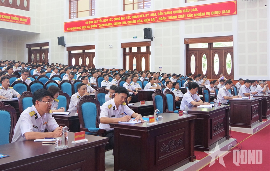 Chuẩn đô đốc Nguyễn Hữu Thoan, Bí thư Đảng ủy, Chính ủy Học viện dự và chỉ đạo hội nghị. Đại tá Lại Hồng Đông, Phó giám đốc Học viện chủ trì hội nghị.