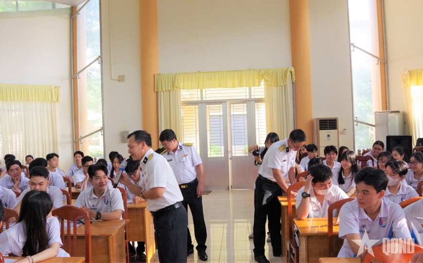 Tại mỗi điểm trường, đoàn công tác của Học viện Hải quân trực tiếp gặp gỡ, trao đổi và thông tin đến học sinh về vị trí, vai trò của biển, đảo Việt Nam đối với sự nghiệp xây dựng và bảo vệ Tổ quốc; truyền thống hơn 70 năm xây dựng, chiến đấu và trưởng thành của Quân chủng Hải quân, Học viện Hải quân.