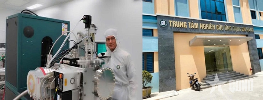 | Đại tá, PGS, TS Nguyễn Tiến Anh, Phó chủ nhiệm Bộ môn Vật lý, Khoa Hóa - Lý Kỹ thuật bên hệ thống Magnetron sputtering trong Phòng sạch (ảnh bên trái); bên ngoài Trung tâm Nghiên cứu ứng dụng Công nghệ nano (ảnh bên phải). |