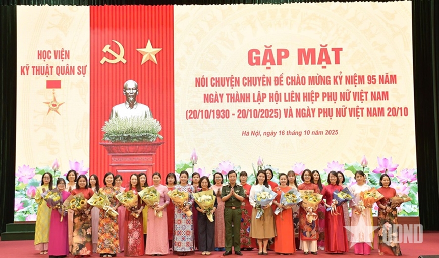| Thủ trưởng Học viện Kỹ thuật Quân sự tặng hoa cán bộ, hội viên phụ nữ Học viện Kỹ thuật Quân sự. |