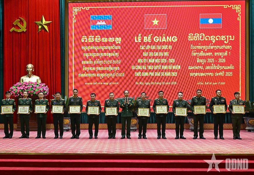 | Trung tướng, PGS, TS Lê Văn Hải, Phó chính ủy Học viện Quốc phòng trao thưởng các học viên Việt Nam, Lào và Campuchia có thành tích tiêu biểu. Ảnh: THÁI HƯNG |
