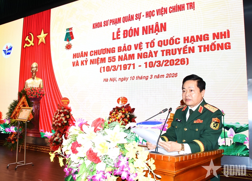 | Thừa ủy quyền của Chủ tịch nước, Trung tướng, PGS, TS Đặng Sỹ Lộc trao Huân chương Bảo vệ Tổ quốc hạng Nhì tặng Khoa Sư phạm quân sự. |