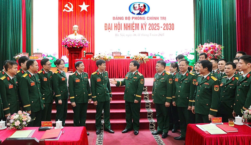 Lãnh đạo Học viện Hậu cần với cán bộ, đảng viên tại Đại hội Đảng bộ Phòng Chính trị nhiệm kỳ 2025-2030. Ảnh: THANH TUYỀN