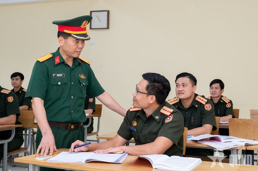 Đại tá Nguyễn Văn Cường, Hệ trưởng Hệ 4, Học viện Chính trị kiểm tra việc học tập trên giảng đường của học viên Quân đội nhân dân Lào. Ảnh: TRUNG THÀNH
