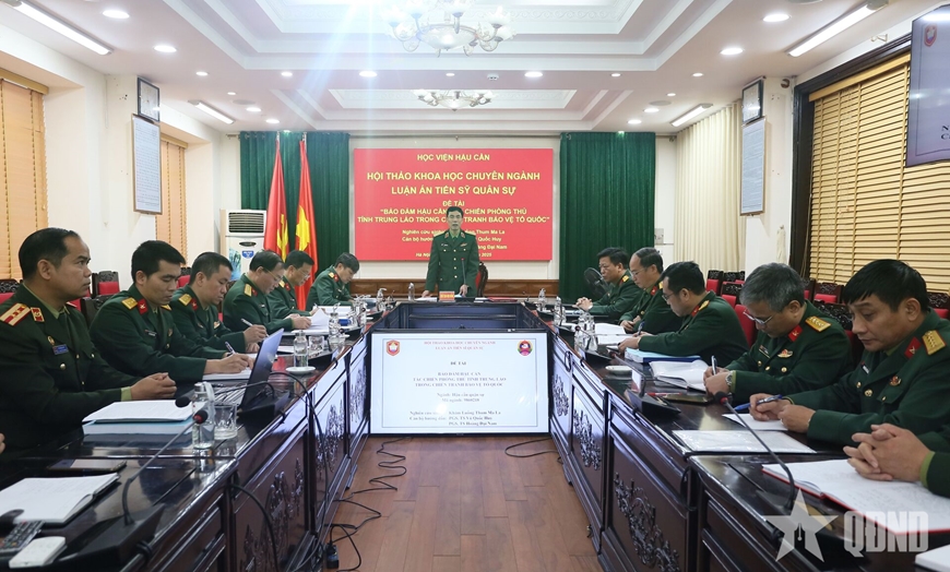 | Trung tướng, GS, TS Phan Tùng Sơn, Giám đốc Học viện Hậu cần chủ trì hội thảo khoa học tại học viện. Ảnh: XUÂN BÁCH |