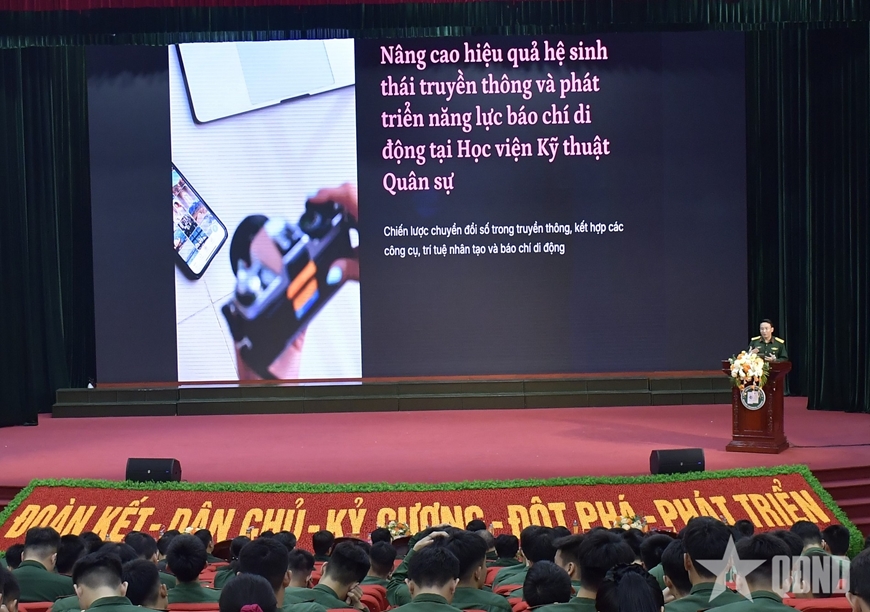 Phát biểu khai mạc tập huấn, Đại tá Đỗ Ngọc Thanh, Chủ nhiệm Chính trị Học viện Kỹ thuật Quân sự nhấn mạnh: Lớp tập huấn được tổ chức nhằm bồi dưỡng kỹ năng, phương pháp cơ bản trong viết, biên tập tin, bài trên các trang thông tin điện tử; ứng dụng một số kỹ năng truyền hình hiện đại trong công tác thông tin, tuyên truyền cho cán bộ, giảng viên, nhân viên, học viên, sinh viên; qua đó góp phần nâng cao chất lượng công tác thông tin, tuyên truyền. Đây chính là nền tảng để mỗi cá nhân trở thành một “chiến sĩ thông tin” tinh nhuệ tại đơn vị. Vì vậy, Đại tá Đỗ Ngọc Thanh đề nghị các đồng chí học viên tham gia lớp tập huấn cần quán triệt đầy đủ, sâu sắc mục đích, yêu cầu trong quá trình tập huấn, xác định rõ thái độ, trách nhiệm, chấp hành nghiêm kỷ luật; tiếp thu hiệu quả những kiến thức, kinh nghiệm do các đồng chí giáo viên truyền thụ; tăng cường học hỏi, trao đổi, bổ sung kiến thức, kỹ năng viết, biên tập tin bài…