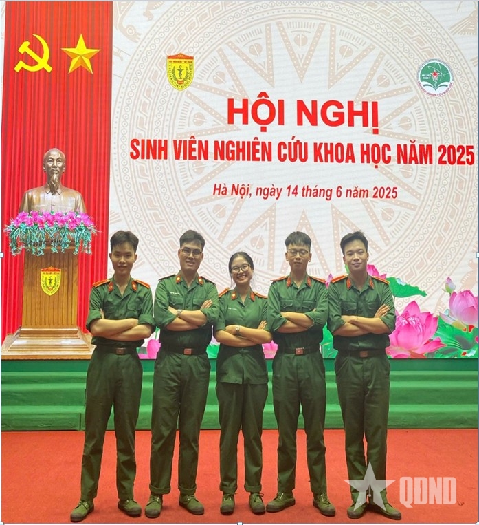 Trần Lệ Quyên (giữa) tham gia Hội nghị sinh viên nghiên cứu khoa học năm 2025 của Học viện Quân y và đoạt giải Nhất cùng đồng đội.