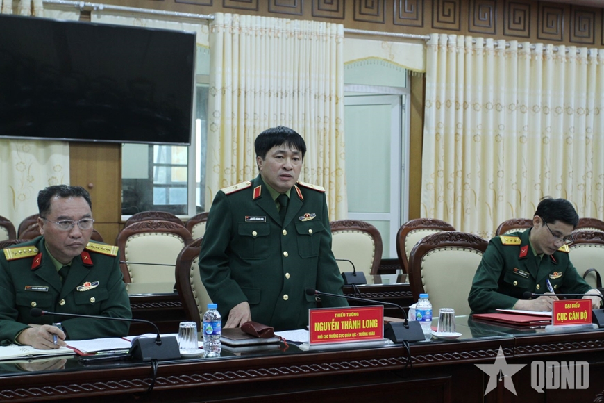| Thiếu tướng Nguyễn Thành Long, Phó cục trưởng Cục Quân lực, phát biểu tại hội nghị. |
