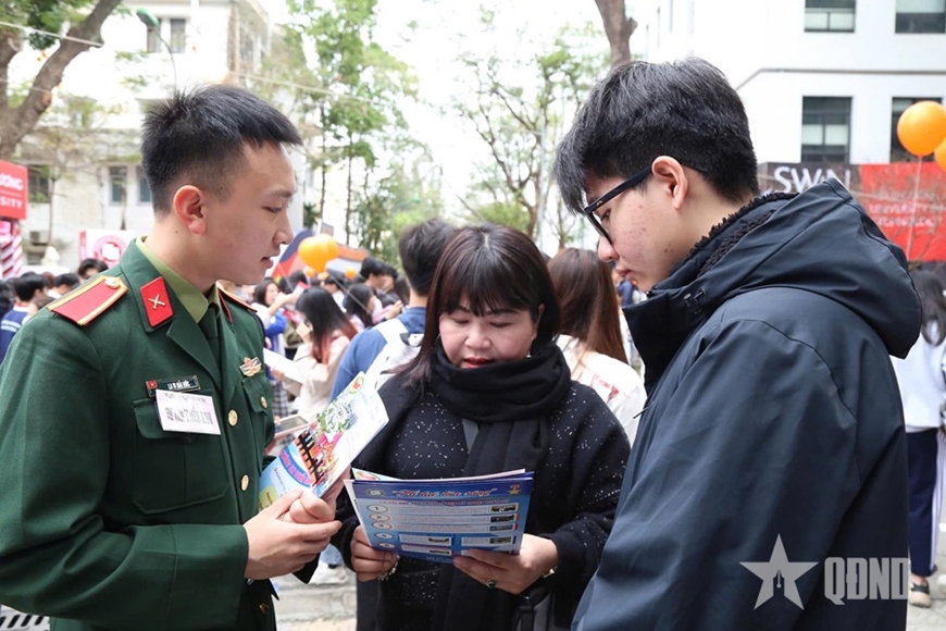 Học viên Trường Sĩ quan Chính trị tư vấn cho phụ huynh và thí sinh về công tác tuyển sinh của nhà trường, tháng 3-2025. Ảnh: QUANG ĐẠO