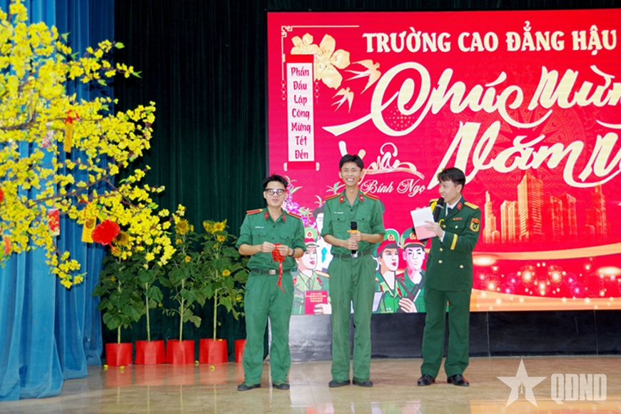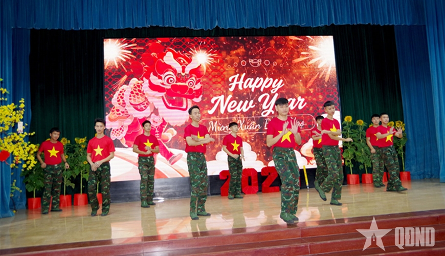 Khu vực sân trung tâm của Nhà trường được trang hoàng cờ hoa, băng rôn, câu đối đỏ, tạo nên không gian đậm sắc xuân. Điểm nhấn của chương trình vui xuân, đón Tết là hội thi văn hóa, văn nghệ với các tiết mục ca múa nhạc ca ngợi Đảng, Bác Hồ, quê hương, đất nước và truyền thống Quân đội, đơn vị cùng với hội thi hái hoa dân chủ, trò chơi dân gian, chúc Tết cán bộ, học viên, chiến sĩ. Những tràng pháo tay cổ vũ không ngớt đã tạo nên bầu không khí sôi nổi, rộn ràng, ấm áp tình đồng chí, đồng đội trong đầu năm mới.