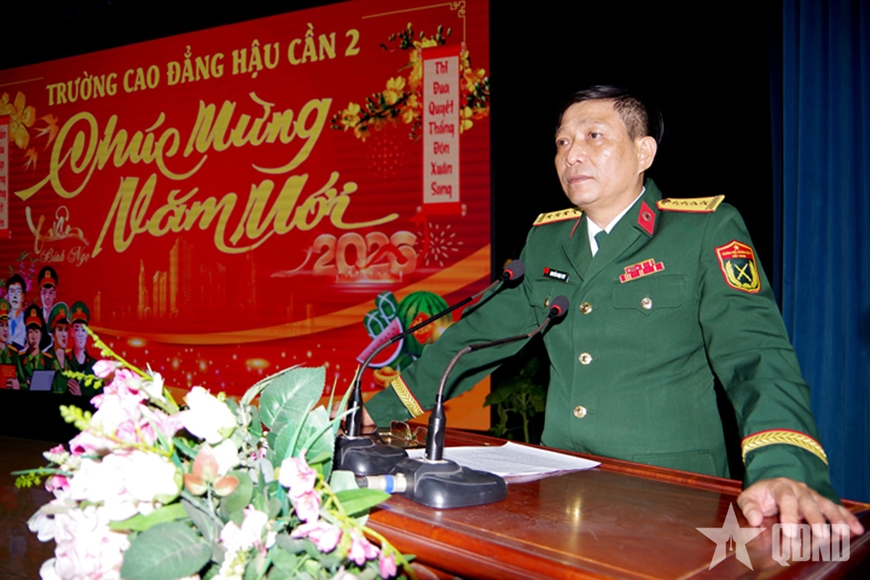 | Đại tá Nguyễn Ngọc Huy, Hiệu trưởng Trường Cao đẳng Hậu cần 2 chúc Tết cán bộ, giáo viên, học viên, chiến sĩ. |