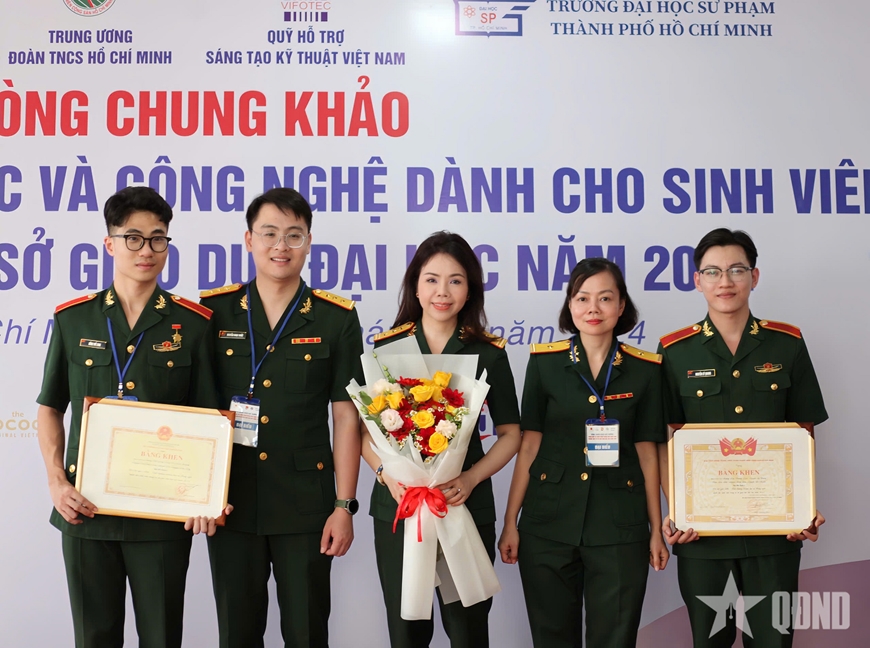 | Thượng sĩ Đồng Thế Long (ngoài cùng bên trái) cùng nhóm nghiên cứu đoạt giải nhất tại Hội nghị khoa học và công nghệ dành cho sinh viên trong cơ sở giáo dục đại học năm 2024. |