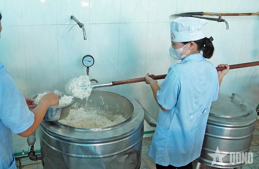 Hằng ngày, các chị thuộc bộ phận phục vụ luôn bảo đảm cơm chín, nước sôi. |