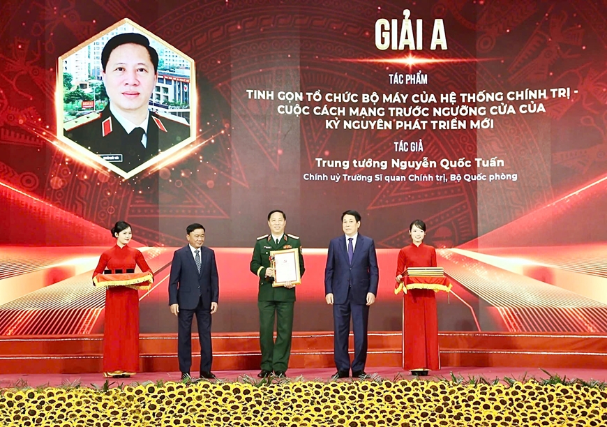 Trong các tác phẩm đạt giải, nổi bật nhất là tác phẩm của Trung tướng Nguyễn Quốc Tuấn - Chính ủy Trường Sĩ quan Chính trị, đạt giải A với bài viết chính luận sâu sắc: “Tinh gọn tổ chức bộ máy của hệ thống chính trị - cuộc cách mạng trước ngưỡng cửa của kỷ nguyên phát triển mới”. Tác phẩm được Hội đồng Giám khảo đánh giá cao về tư duy lý luận sắc bén, lập luận chặt chẽ và tầm nhìn chiến lược.
