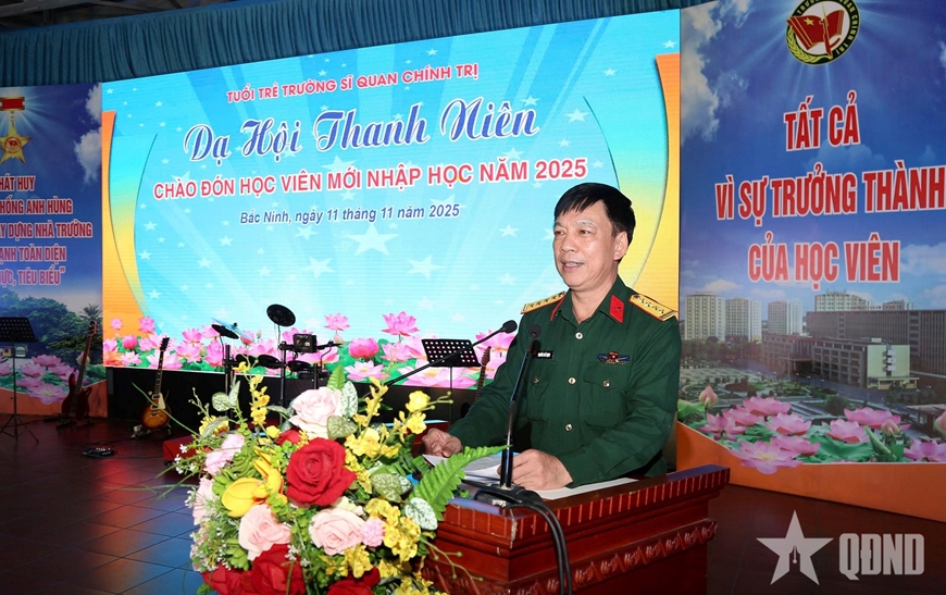 Đại tá Nguyễn Thế Mạnh, Phó chính ủy Trường Sĩ quan Chính trị phát biểu chào mừng dạ hội thanh niên.