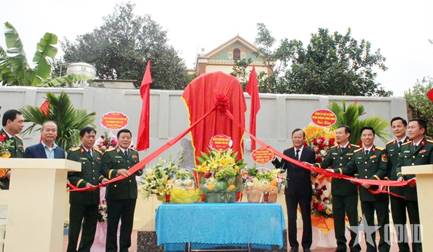 | Thiếu tướng Đinh Ngọc Tường (thứ tư, từ trái sang) và các đại biểu thực hiện nghi thức khánh thành công trình. |