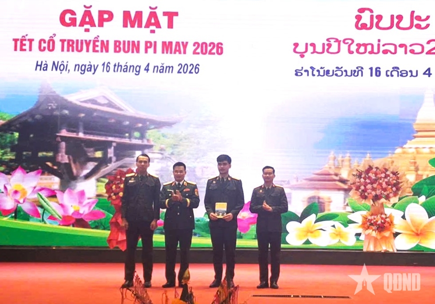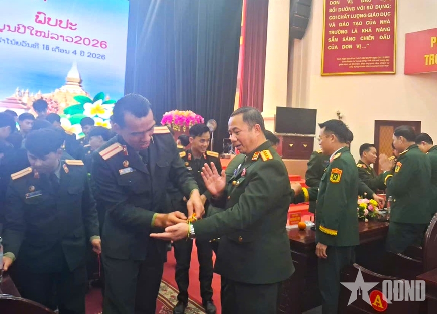 Trong niềm vui của ngày Tết cổ truyền các bộ tộc Lào, thay mặt Đảng ủy, Ban giám hiệu Trường Sĩ quan Lục quân 1, Thiếu tướng Nguyễn Khắc Thơm tặng quà và giao lưu buộc chỉ cổ tay, té nước với các đồng chí học viên Quân đội nhân dân Lào theo phong tục Tết cổ truyền Bunpimay.