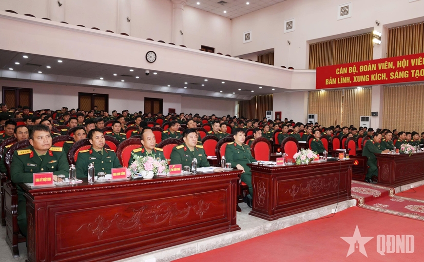 Thiếu tướng Phạm Quốc Tuấn, Phó hiệu trưởng Trường Sĩ quan Lục quân 1 phát biểu tại hội nghị.