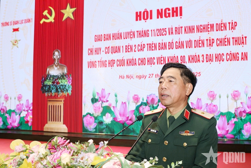 Thiếu tướng Phạm Quốc Tuấn, Phó hiệu trưởng Trường Sĩ quan Lục quân 1, Phó trưởng ban Thường trực Ban chỉ đạo diễn tập chủ trì hội nghị.