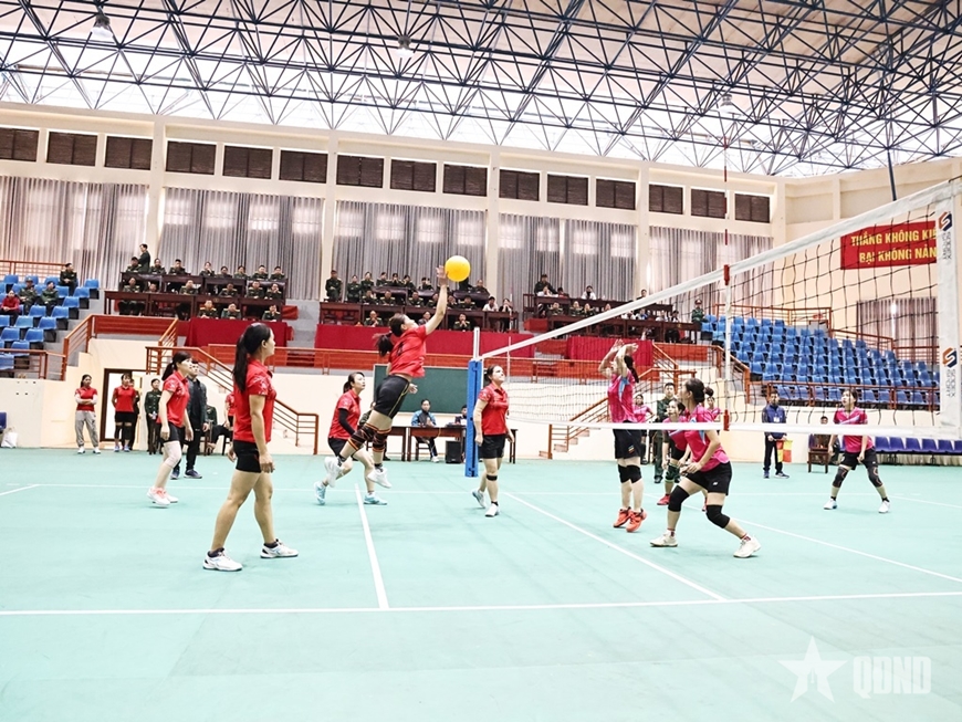 | Trận chung kết bóng chuyền hơi nữ giữa đội tuyển Phòng Tham mưu Hành chính và Phòng Đào tạo. |