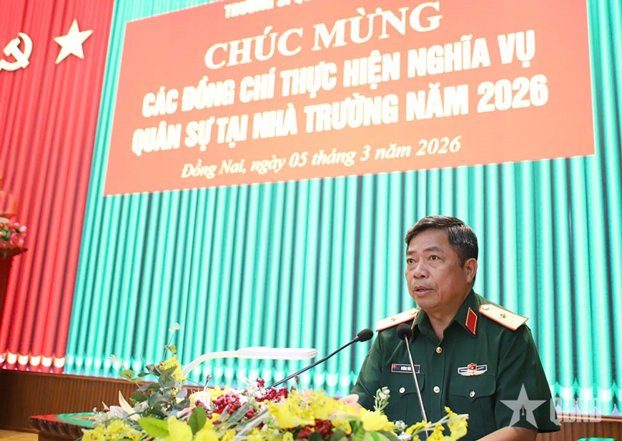 Thiếu tướng Dương Văn Sự, Phó hiệu trưởng Trường Sĩ quan Lục quân 2 phát biểu chúc mừng các chiến sĩ mới.