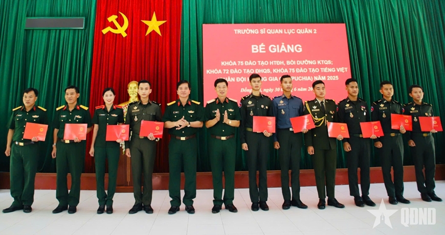 Ban giám hiệu Trường Sĩ quan Lục quân 2 trao bằng tốt nghiệp tặng các học viên đạt thành tích xuất sắc và giỏi. |