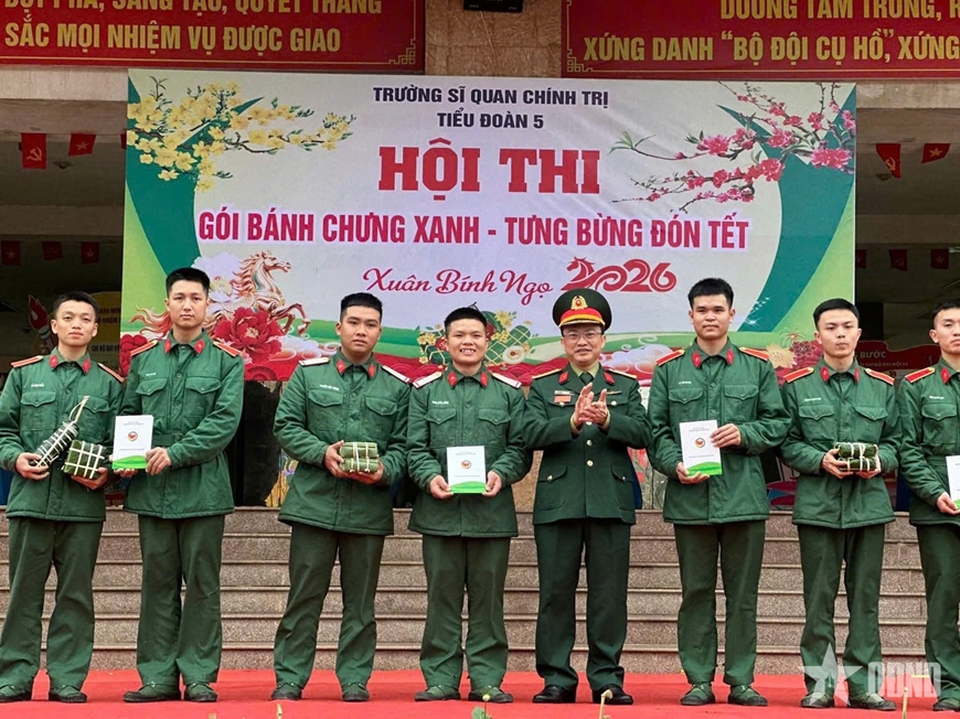 Đón Tết tại Trường Sĩ quan Chính trị không chỉ dừng lại ở việc trang trí hay tổ chức hoạt động vui chơi. Điều ý nghĩa hơn cả là xây dựng không khí đầm ấm như một gia đình lớn. Các đơn vị tích cực tổ chức viếng nghĩa trang liệt sĩ, thăm hỏi, động viên gia đình chính sách. Những phần quà nhỏ nhưng chứa đựng sự quan tâm, sẻ chia sâu sắc. Đặc biệt, bữa cơm đón Tết được tổ chức trang trọng, ấm cúng. Những món ăn truyền thống như bánh chưng, giò, nem… khiến học viên cảm nhận rõ hương vị Tết quê hương ngay trong đơn vị.