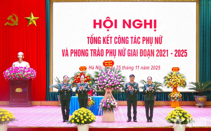 | Lãnh đạo Ban Phụ nữ Quân đội tặng hoa chúc mừng hội nghị. |