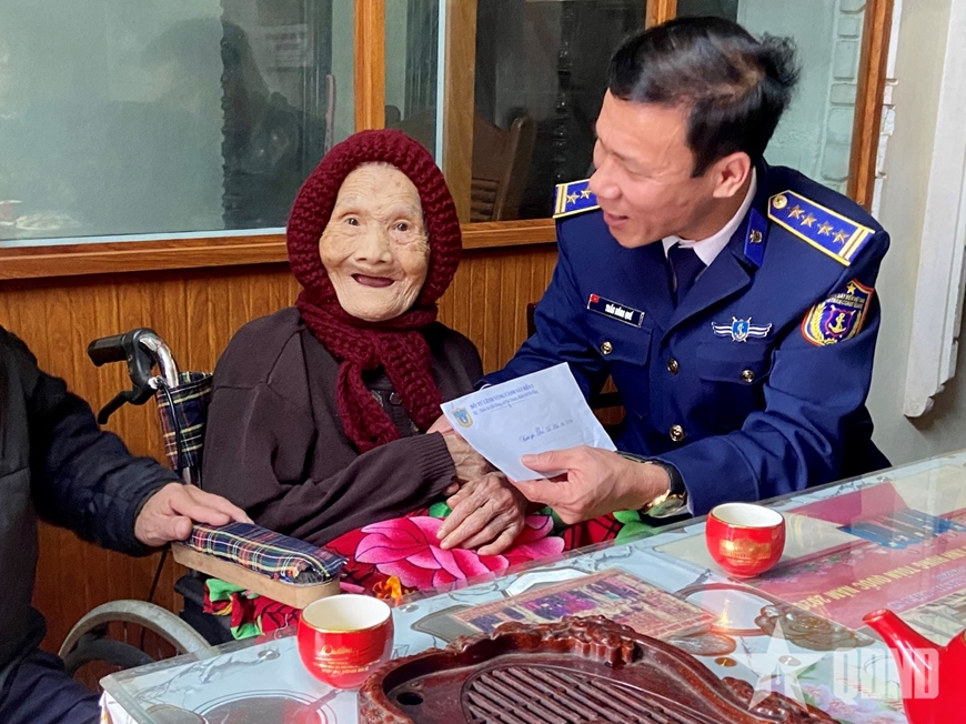 | Đoàn công tác thăm, tặng quà Bà Mẹ Việt Nam Anh hùng Nguyễn Thị Phước. |