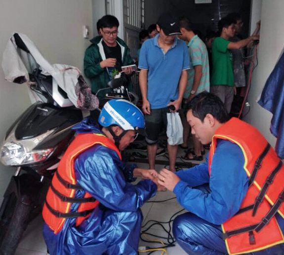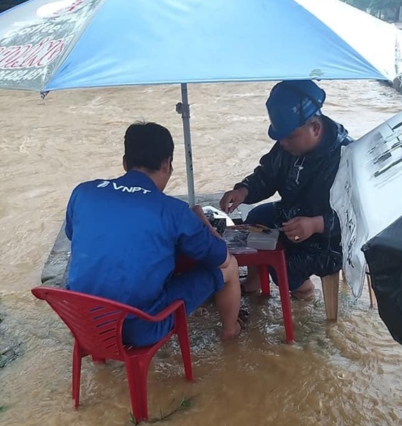 Không quản mưa lũ, nhân viên VNPT triển khai các hoạt động hỗ trợ khách hàng. |