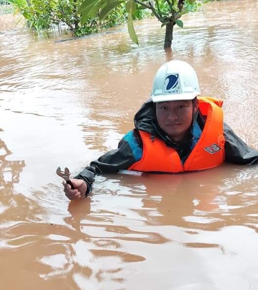 Ngâm mình trong dòng nước lũ để bảo đảm mạch thông tin. |