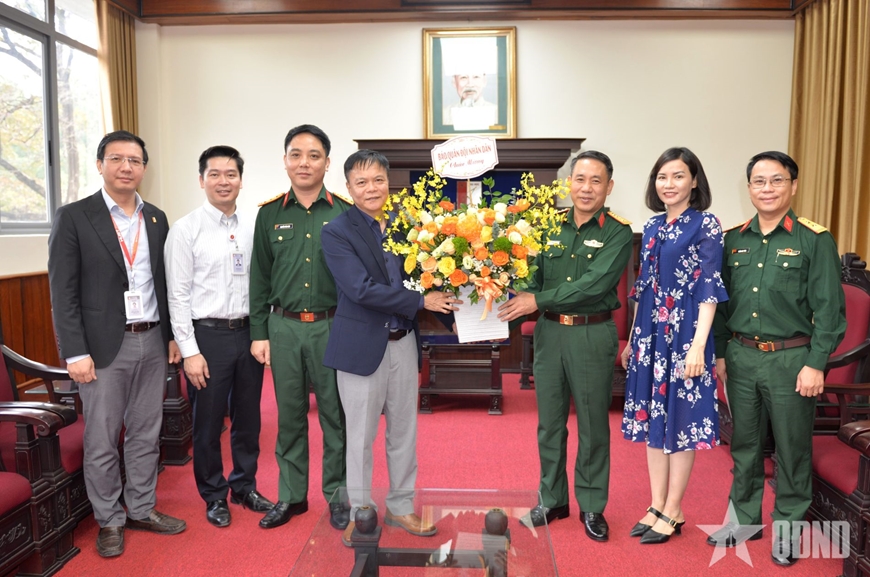 | Đoàn công tác Báo Quân đội nhân dân tặng hoa chúc mừng Trường Đại học Mở Hà Nội. |