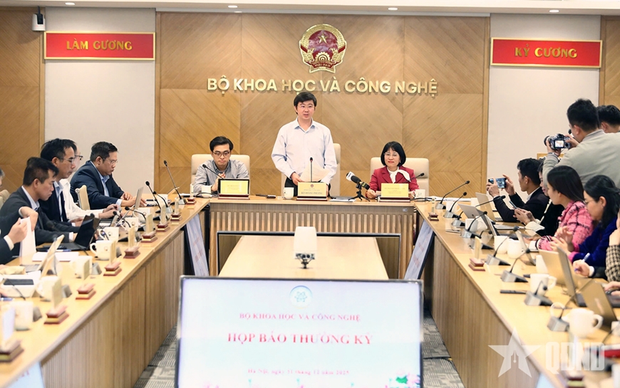 | Thứ trưởng Bộ Khoa học và Công nghệ Bùi Hoàng Phương chủ trì họp báo. |