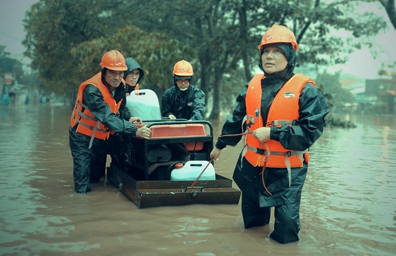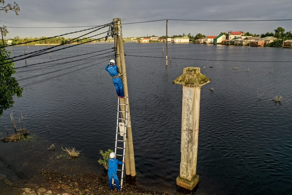 Nhân viên kỹ thuật viễn thông làm việc ở vùng bị cô lập do mưa lũ. |